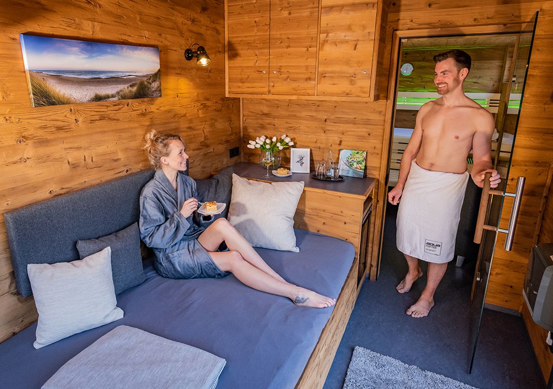 Die hochwertigen Saunahäuser punkten mit einem beheizten Ruheraum inklusive gefüllter Minibar und direkt anschließendem Saunabereich. Durch ein Fläschchen wohltuenden Wellnessaufguss haben Sie die Möglichkeit ihren eigenen Aufguss zu gestalten. Handtücher und Bademäntel werden ihnen am Empfang zur Verfügung gestellt. Ein liebevoll angelegter Garten mit Liegen und eigener Dusche lädt zum verweilen ein. DaySpa-Haus buchen!